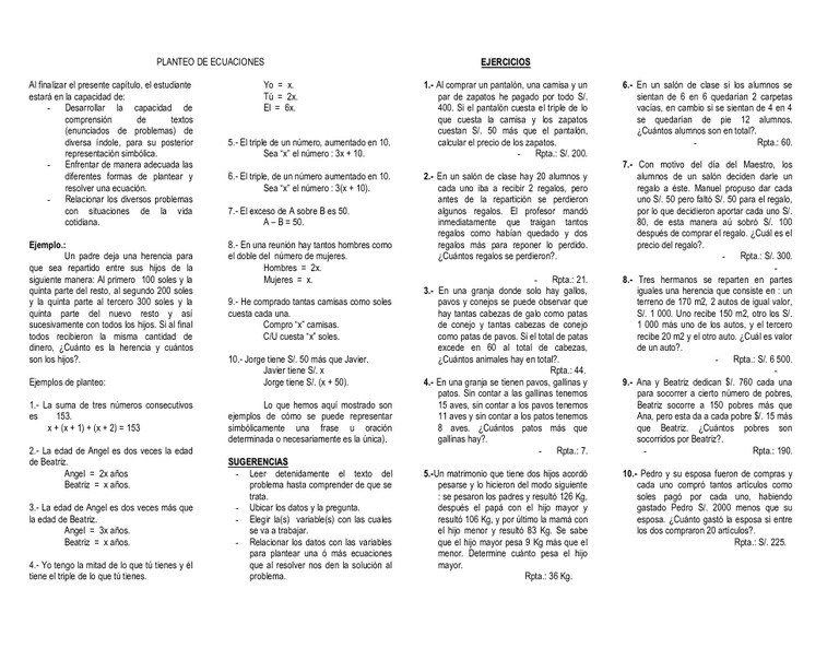 de diversa ndole, para su posterior representacin simblica. - Enfrentar de manera adecuada las diferentes formas de plantear y resolver una ecuacin. - Relacionar los diversos problemas con situaciones de la vida cotidiana. Ejemplo.: Un padre deja una herencia para que sea repartido entre sus hijos de la siguiente manera: Al primero 100 soles y la quinta parte del resto, al segundo 200 soles y la quinta parte al tercero 300 soles y la quinta parte del nuevo resto y as sucesivamente con todos los hijos. Si al final todos recibieron la misma cantidad de dinero, Cunto es la herencia y cuntos son los hijos?. Ejemplos de planteo: 1.- La suma de tres nmeros consecutivos es 153. x + (x + 1) + (x + 2) = 153 2.- La edad de Angel es dos veces la edad de Beatriz. Angel = 2x aos Beatriz = x aos. 3.- La edad de Angel es dos veces ms que la edad de Beatriz. Angel = 3x aos. Beatriz = x aos. 4.- Yo tengo la mitad de lo que t tienes y l tiene el triple de lo que t tienes. Yo = x. T = 2x. El = 6x. 5.- El triple de un nmero, aumentado en 10. Sea x el nmero : 3x + 10. 6.- El triple, de un nmero aumentado en 10. Sea x el nmero : 3(x + 10). 7.- El exceso de A sobre B es 50. A B = 50. 8.- En una reunin hay tantos hombres como el doble del nmero de mujeres. Hombres = 2x. Mujeres = x. 9.- He comprado tantas camisas como soles cuesta cada una. Compro x camisas. C/U cuesta x soles. 10.- Jorge tiene S/. 50 ms que Javier. Javier tiene S/. x Jorge tiene S/. (x + 50). Lo que hemos aqu mostrado son ejemplos de cmo se puede representar simblicamente una frase u oracin determinada o necesariamente es la nica). SUGERENCIAS - Leer detenidamente el texto del problema hasta comprender de que se trata. - Ubicar los datos y la pregunta. - Elegir la(s) variable(s) con las cuales se va a trabajar. - Relacionar los datos con las variables para plantear una ms ecuaciones que al resolver nos den la solucin al problema.