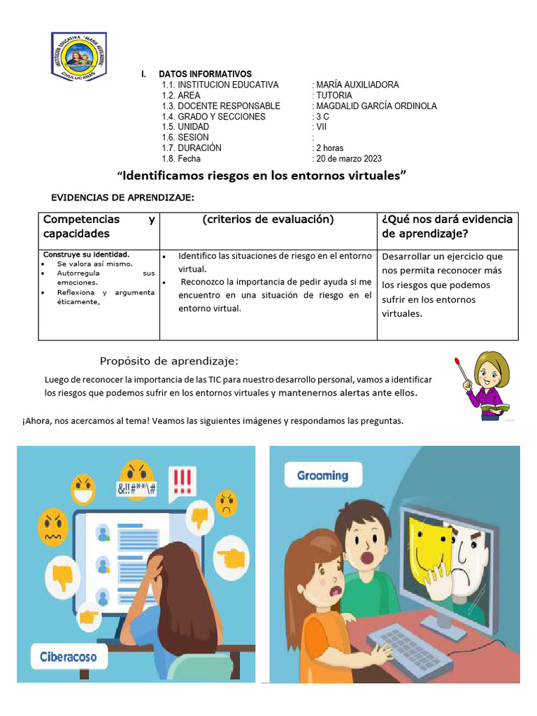 Construye su identidad. • Identifico las situaciones de riesgo en el entorno Desarrollar un ejercicio que