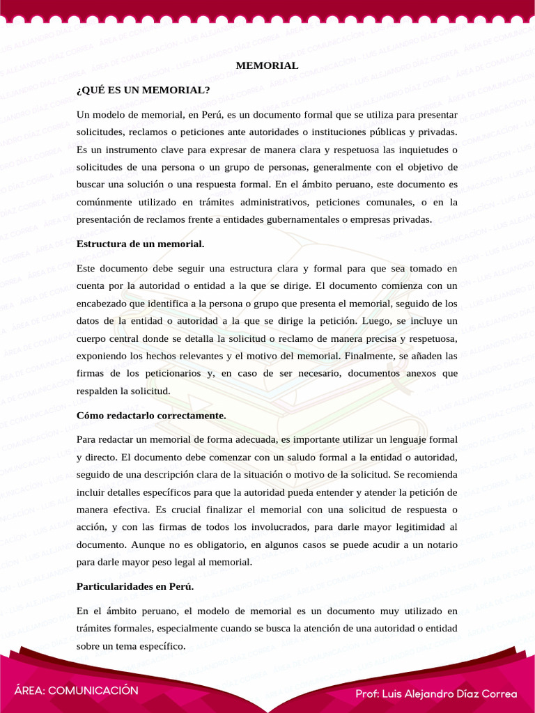 Un modelo de memorial, en Perú, es un documento formal que se utiliza para presentar