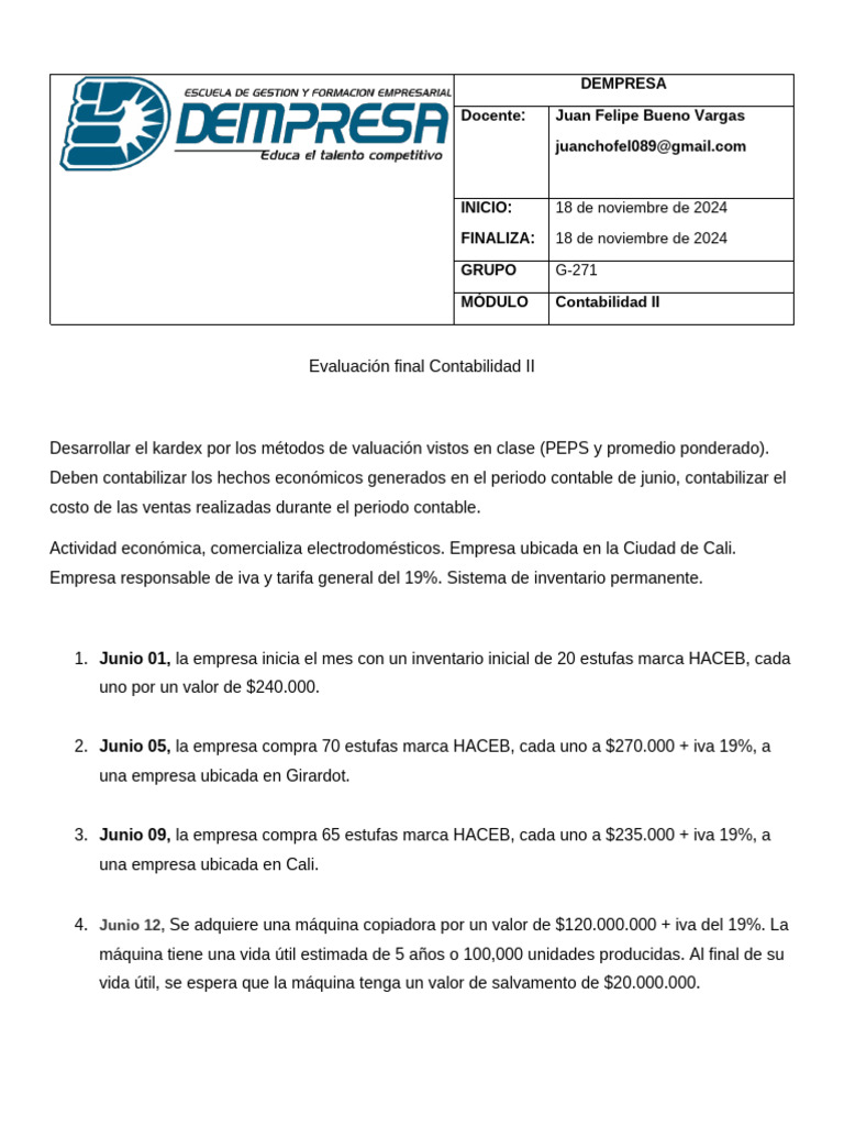 Desarrollar el kardex por los métodos de valuación vistos en clase (PEPS y promedio ponderado).