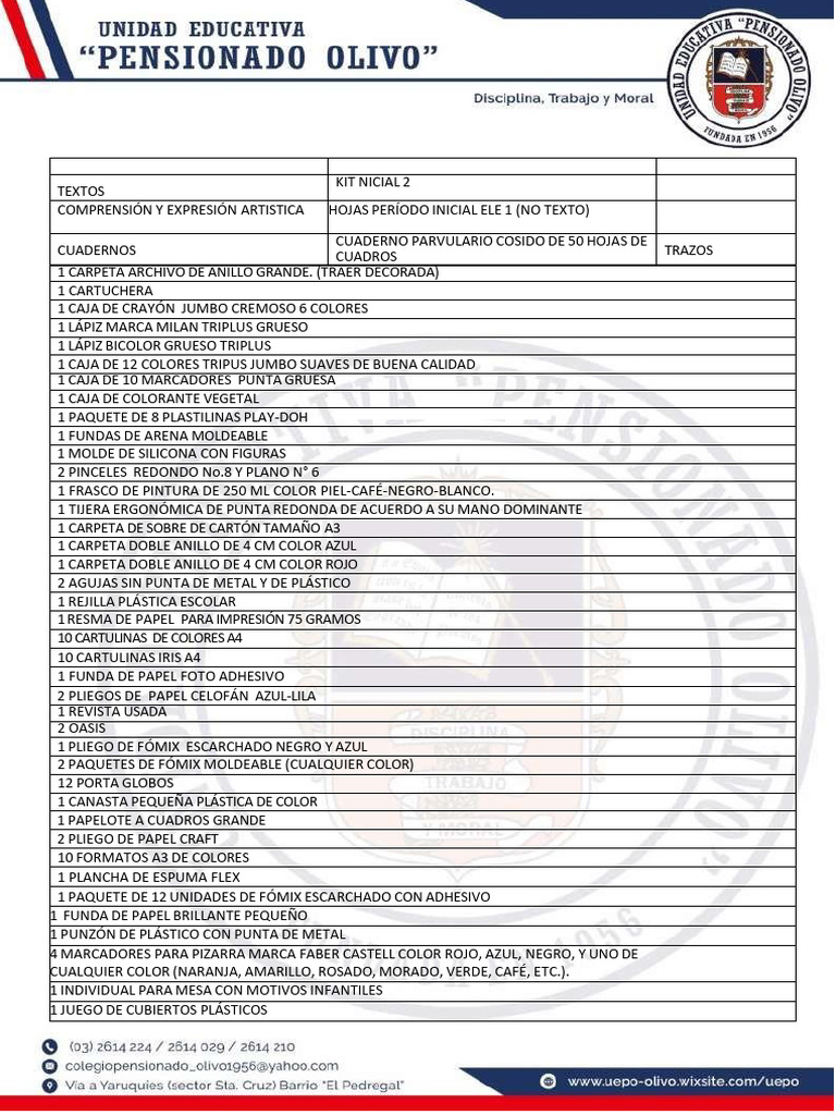 LISTA DE ÚTILES ESCOLARES INICIAL 2