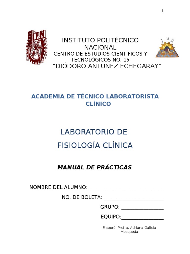 Este manual de laboratorio est dirigido a los estudiantes que cursen la Unidad de Aprendizaje Fisiologa Clnica en el cuarto semestre de la carrera de Tcnico Laboratorista Clnico, en el Centro de Estudios Cientficos y Tecnolgicos No. 15 Didoro Antunez Echegaray. El programa de estudios de Fisiologa Clnica sustituye al programa de estudios de la asignatura Morfofisiologa el cual se enfocaba particularmente en la Anatoma y Fisiologa del cuerpo Humano, sin embargo y debido a la vinculacin con otras asignaturas como Biologa Humana cursada en el mismo semestre curricular, se reestructuro de tal forma que se enfocar principalmente en el funcionamiento del cuerpo humano sin dejar de recordar la Anatoma Humana como base fundamental de este programa de estudios. Este nuevo enfoque contribuye a proporcionar al estudiante las bases para el conocimiento de las funciones del cuerpo y de sta forma la importancia y el fundamento de la realizacin de los estudios de laboratorio clnico en relacin a las Unidades de Aprendizaje posteriores en el Carrera de Tcnico Laboratorista Clnico.