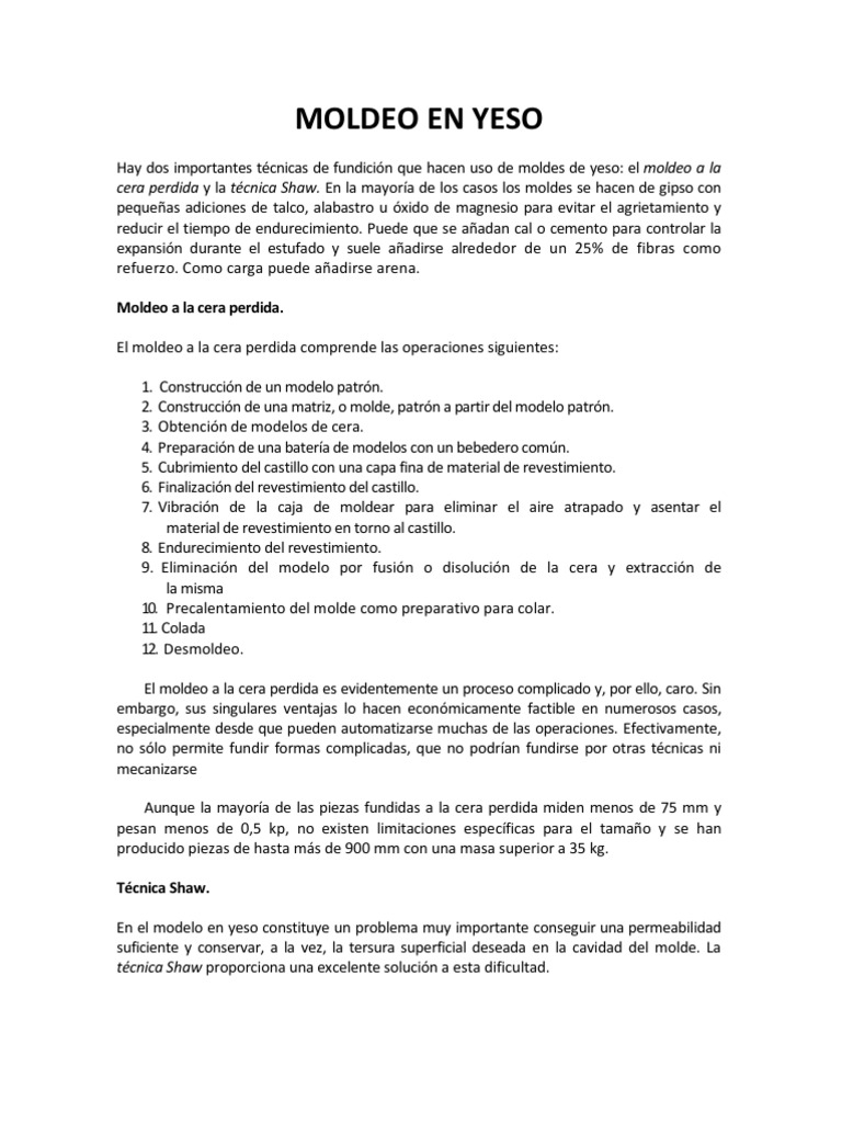 Hay dos importantes tcnicas de fundicin que hacen uso de moldes de yeso: el moldeo a la cera perdida y la tcnica Shaw. En la mayora de los casos los moldes se hacen de gipso con pequeas adiciones de talco, alabastro u xido de magnesio para evitar el agrietamiento y reducir el tiempo de endurecimiento. Puede que se aadan cal o cemento para controlar la expansin durante el estufado y suele aadirse alrededor de un 25% de fibras como refuerzo. Como carga puede aadirse arena. Moldeo a la cera perdida. El moldeo a la cera perdida comprende las operaciones siguientes: 1. 2. 3. 4. 5. 6. 7. Construccin de un modelo patrn. Construccin de una matriz, o molde, patrn a partir del modelo patrn. Obtencin de modelos de cera. Preparacin de una batera de modelos con un bebedero comn. Cubrimiento del castillo con una capa fina de material de revestimiento. Finalizacin del revestimiento del castillo. Vibracin de la caja de moldear para eliminar el aire atrapado y asentar el material de revestimiento en torno al castillo. 8. Endurecimiento del revestimiento. 9. Eliminacin del modelo por fusin o disolucin de la cera y extraccin de la misma 10. Precalentamiento del molde como preparativo para colar. 11. Colada 12. Desmoldeo. El moldeo a la cera perdida es evidentemente un proceso complicado y, por ello, caro. Sin embargo, sus singulares ventajas lo hacen econmicamente factible en numerosos casos, especialmente desde que pueden automatizarse muchas de las operaciones. Efectivamente, no slo permite fundir formas complicadas, que no podran fundirse por otras tcnicas ni mecanizarse Aunque la mayora de las piezas fundidas a la cera perdida miden menos de 75 mm y pesan menos de 0,5 kp, no existen limitaciones especficas para el tamao y se han producido piezas de hasta ms de 900 mm con una masa superior a 35 kg. Tcnica Shaw. En el modelo en yeso constituye un problema muy importante conseguir una permeabilidad suficiente y conservar, a la vez, la tersura superficial deseada en la cavidad del molde. La tcnica Shaw proporciona una excelente solucin a esta dificultad.