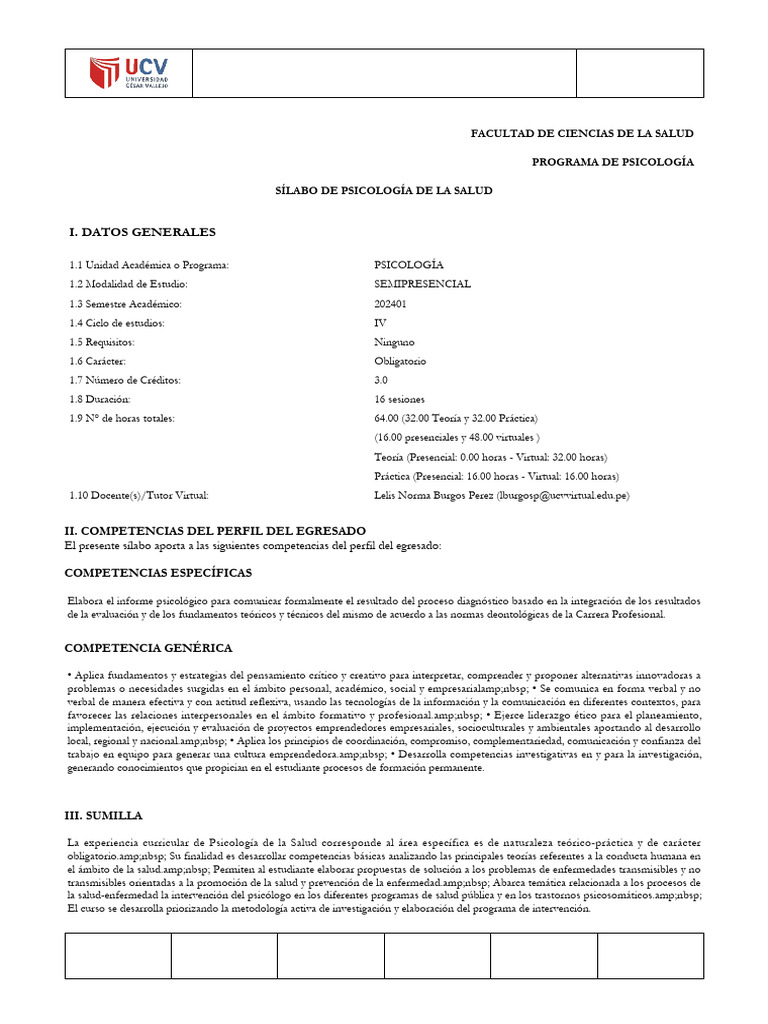 La experiencia curricular de Psicología de la Salud corresponde al área específica es de naturaleza teórico-práctica y de carácter