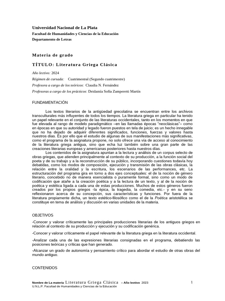 Nombre de La materia L i t e r a t u r a G r i e g a C l á s i c a – Año lectivo 2023 1