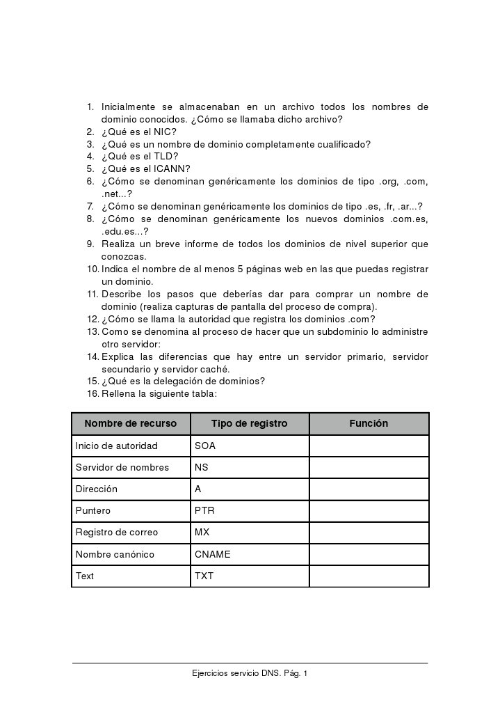 Qu es un nombre de dominio completamente cualificado? 4. Qu es el TLD? 5. Qu es el ICANN? 6. Cmo se denominan genricamente los dominios de tipo .org, .com, .net...? 7. Cmo se denominan genricamente los dominios de tipo .es, .fr, .ar...? 8. Cmo se denominan genricamente los nuevos dominios .com.es, .edu.es...? 9. Realiza un breve informe de todos los dominios de nivel superior que conozcas. 10. Indica el nombre de al menos 5 pginas web en las que puedas registrar un dominio. 11. Describe los pasos que deberas dar para comprar un nombre de dominio (realiza capturas de pantalla del proceso de compra). 12. Cmo se llama la autoridad que registra los dominios .com? 13. Como se denomina al proceso de hacer que un subdominio lo administre otro servidor: 14. Explica las diferencias que hay entre un servidor primario, servidor secundario y servidor cach. 15. Qu es la delegacin de dominios? 16. Rellena la siguiente tabla: Nombre de recurso Inicio de autoridad Servidor de nombres Direccin Puntero Registro de correo Nombre cannico Text Tipo de registro SOA NS A PTR MX CNAME TXT Funcin