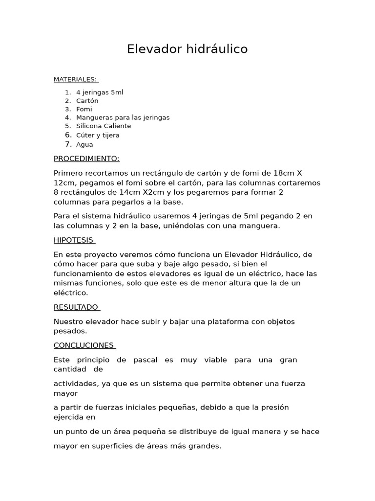 En este proyecto veremos cómo funciona un Elevador Hidráulico, de