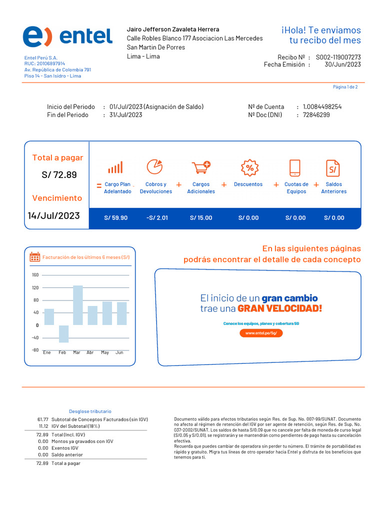 Entel Perú S.A. Lima - Lima Recibo Nº : S002-119007273