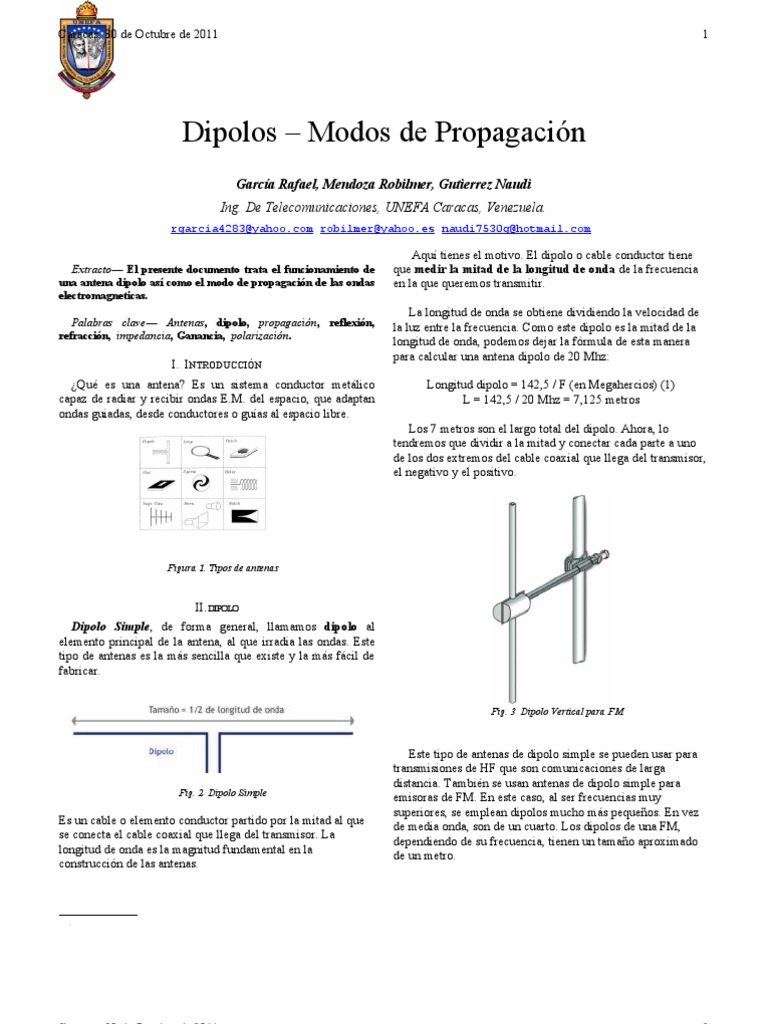 rgarcia4283@yahoo.com robilmer@yahoo.es naudi7530g@hotmail.com Extracto El presente documento trata el funcionamiento de una antena dipolo as como el modo de propagacin de las ondas electromagneticas. Palabras clave Antenas, dipolo, propagacin, reflexin, refraccin, impedancia, Ganancia, polarizacin.