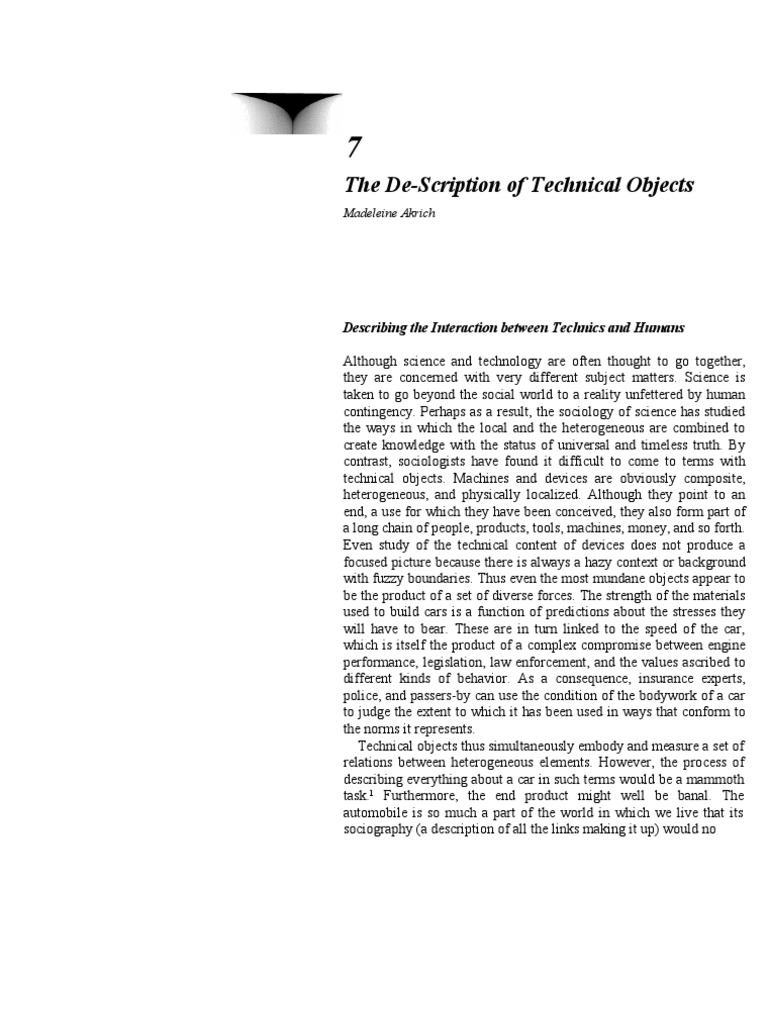Describing the Interaction between Technics and Humans Although science and technology are often thought to go together, they are concerned with very different subject matters. Science is taken to go beyond the social world to a reality unfettered by human contingency. Perhaps as a result, the sociology of science has studied the ways in which the local and the heterogeneous are combined to create knowledge with the status of universal and timeless truth. By contrast, sociologists have found it difficult to come to terms with technical objects. Machines and devices are obviously composite, heterogeneous, and physically localized. Although they point to an end, a use for which they have been conceived, they also form part of a long chain of people, products, tools, machines, money, and so forth. Even study of the technical content of devices does not produce a focused picture because there is always a hazy context or background with fuzzy boundaries. Thus even the most mundane objects appear to be the product of a set of diverse forces. The strength of the materials used to build cars is a function of predictions about the stresses they will have to bear. These are in turn linked to the speed of the car, which is itself the product of a complex compromise between engine performance, legislation, law enforcement, and the values ascribed to different kinds of behavior. As a consequence, insurance experts, police, and passers-by can use the condition of the bodywork of a car to judge the extent to which it has been used in ways that conform to the norms it represents. Technical objects thus simultaneously embody and measure a set of relations between heterogeneous elements. However, the process of describing everything about a car in such terms would be a mammoth task.1 Furthermore, the end product might well be banal. The automobile is so much a part of the world in which we live that its sociography (a description of all the links making it up) would no
