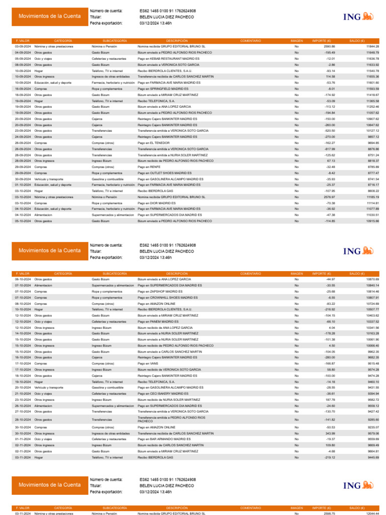 19-09-2024 Otros gastos Gasto Bizum Bizum enviado a PEDRO ALFONSO RIOS PACHECO No -194.84 11057.62
