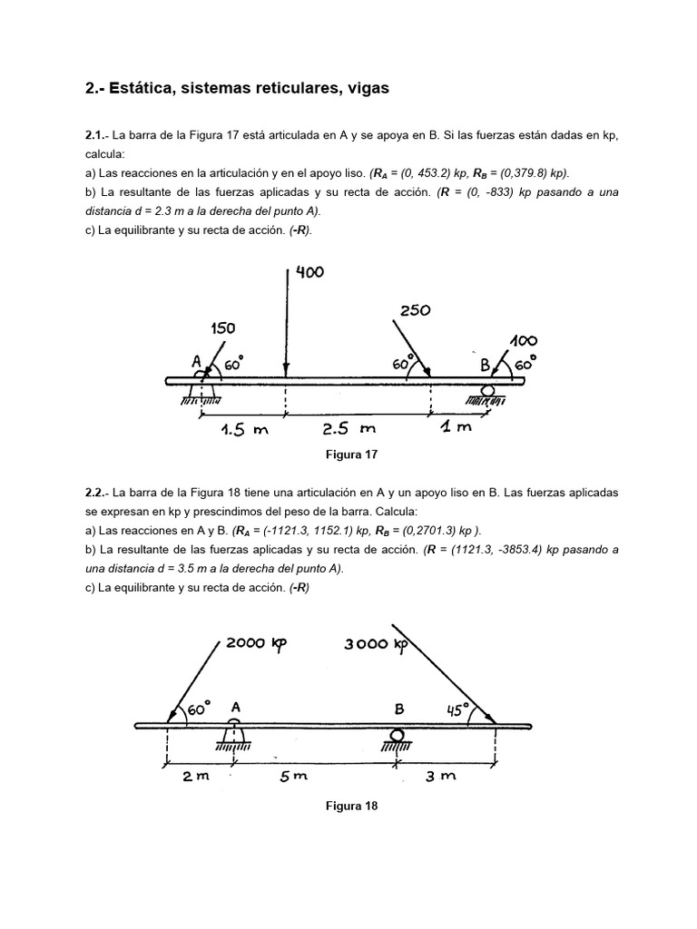 2.1.- La barra de la Figura 17 está articulada en A y se apoya en B. Si las fuerzas están dadas en kp,