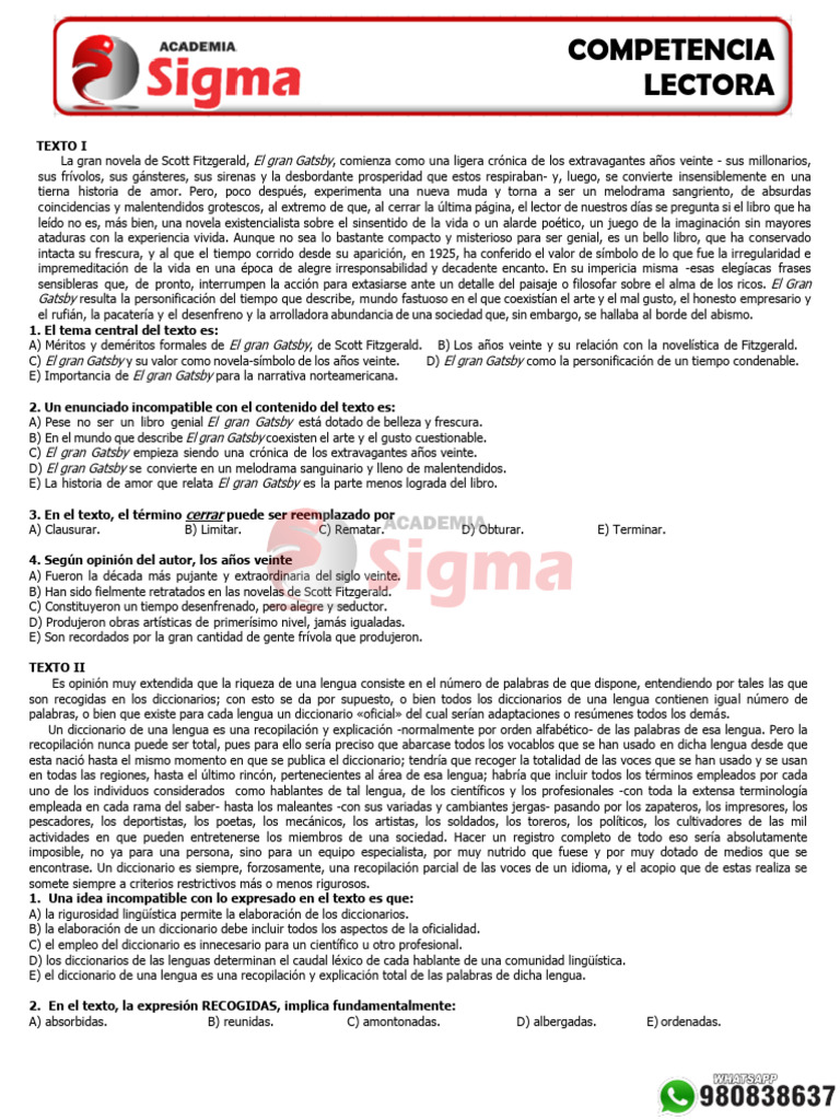 A) Méritos y deméritos formales de El gran Gatsby, de Scott Fitzgerald. B) Los años veinte y su relación con la novelística de Fitzgerald.