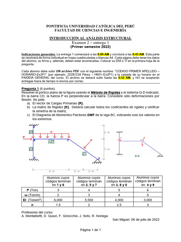 Pregunta 2 (5 puntos) La siguiente estructura está conformada por cuatro barras tipo pórtico