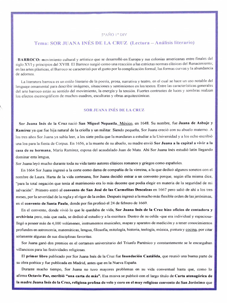 Tema: SOR JUANA INÉS DE LACRUZ (Lectura - Análisis literario)