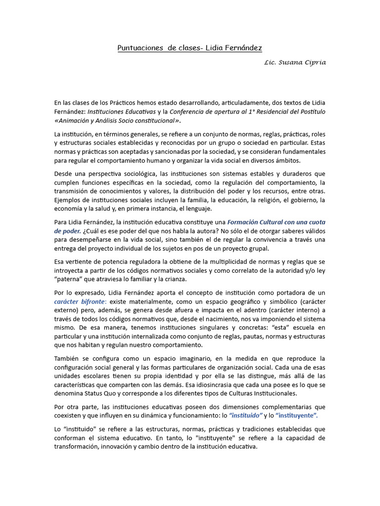 Para Lidia Fernández, la institución educativa constituye una Formación Cultural con una cuota