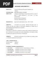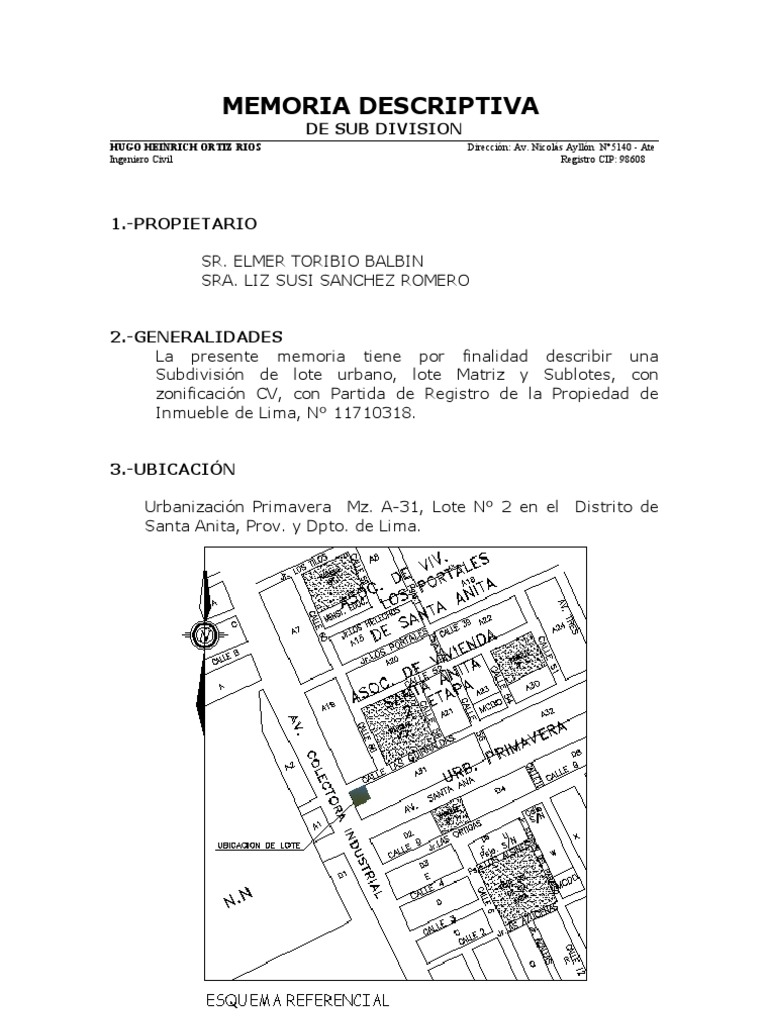 1.-PROPIETARIO SR. ELMER TORIBIO BALBIN SRA. LIZ SUSI SANCHEZ ROMERO 2.-GENERALIDADES La presente memoria tiene por finalidad describir una Subdivisin de lote urbano, lote Matriz y Sublotes, con zonificacin CV, con Partida de Registro de la Propiedad de Inmueble de Lima, N 11710318. 3.-UBICACIN Urbanizacin Primavera Mz. A-31, Lote N 2 en el Santa Anita, Prov. y Dpto. de Lima. Distrito de