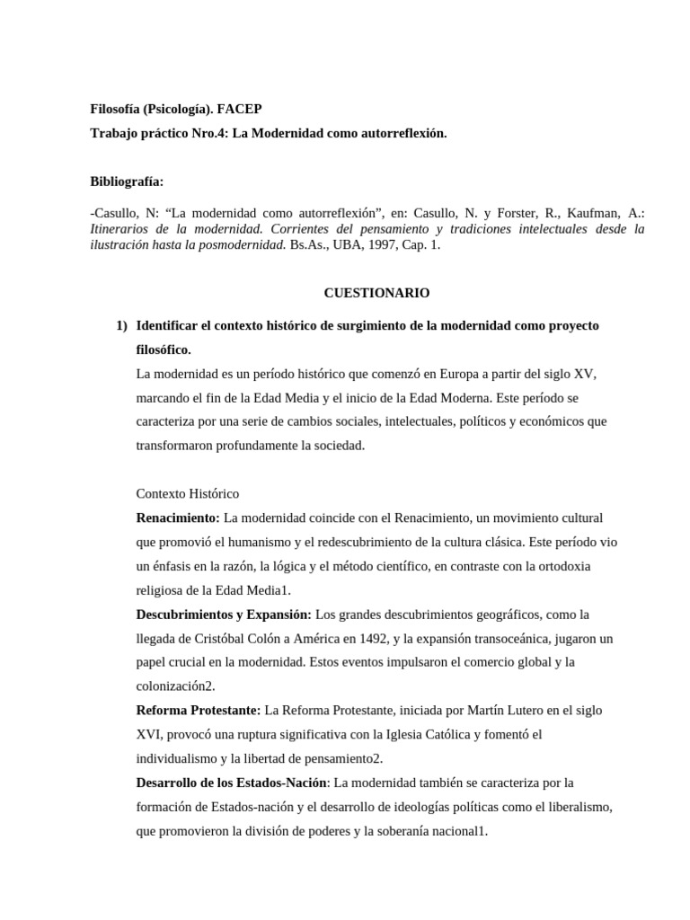 1) Identificar el contexto histórico de surgimiento de la modernidad como proyecto