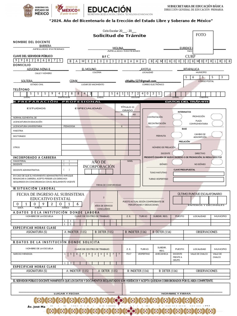 SOLICITUD EN FORMATO OFICIAL. CONTAR CON NOMBRAMIENTO DE PROFESOR