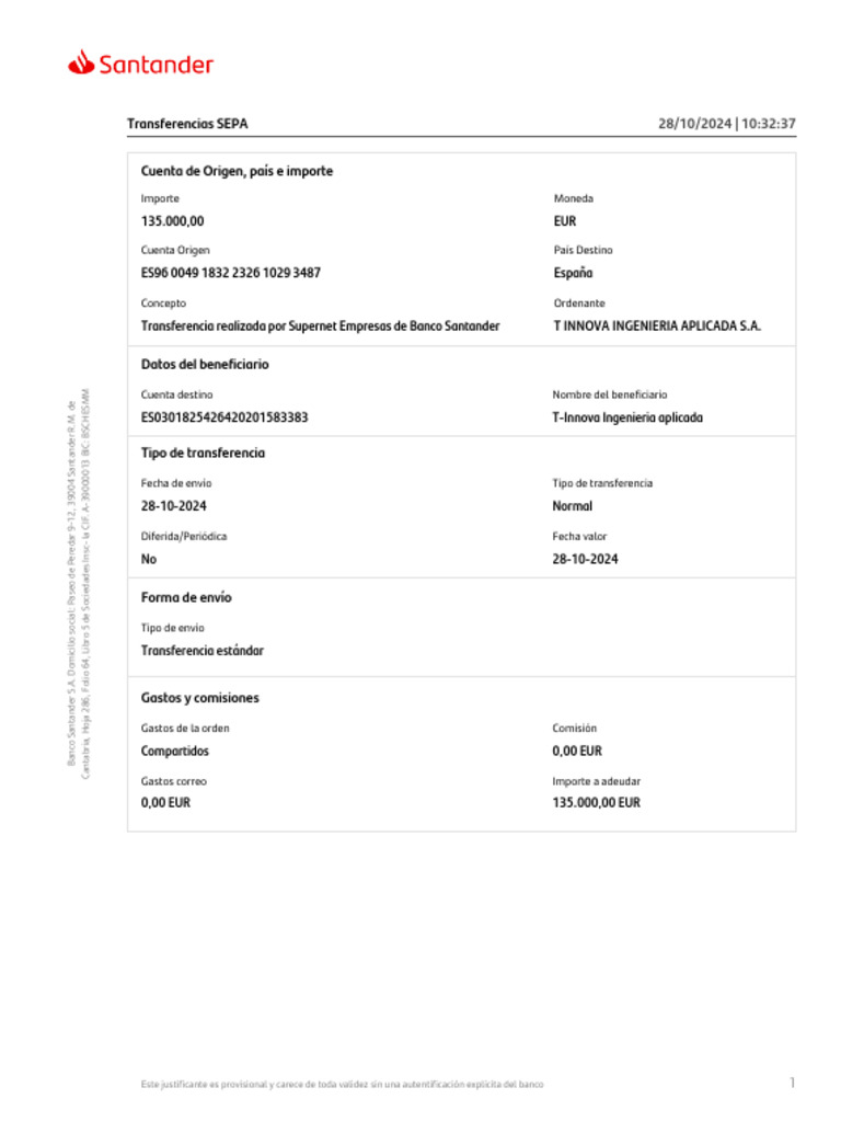 Transferencia realizada por Supernet Empresas de Banco Santander T INNOVA INGENIERIA APLICADA S.A.