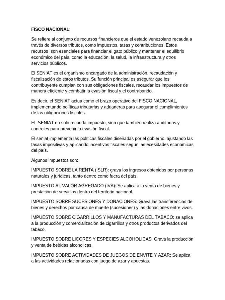 Es decir, el SENIAT actua como el brazo operativo del FISCO NACIONAL,