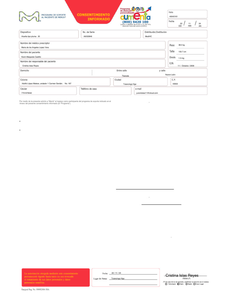 se indican a continuación. Entiendo y acepto que la transmisión de información a través de Internet y líneas cumplimiento con el Programa, cuenten con mis datos personales contenidos en mi expediente clínico y sean