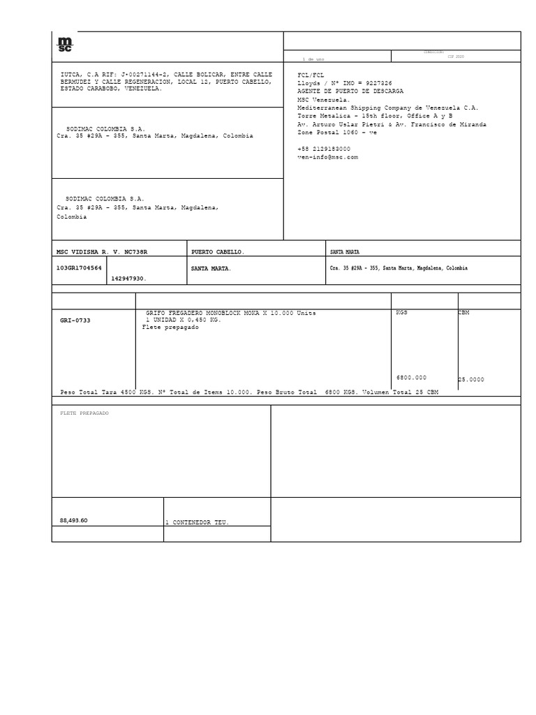Sitio web: www.msc.com Código SCAC: MSCU Nº y SECUENCIA DE B/L ORIGINAL