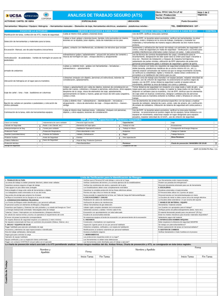 Planificación de tarea, confección de ATS, charla de seguridad. Caída al mismo nivel, golpes y lesiones leves Uso de EPP, verificar zona para caminar.
