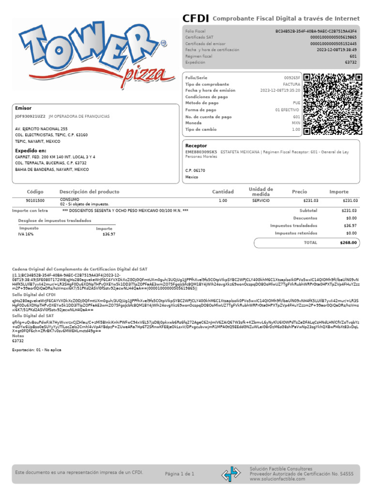 Importe con letra *** DOSCIENTOS SESENTA Y OCHO PESO MEXICANO 00/100 M.N. *** Subtotal $231.03