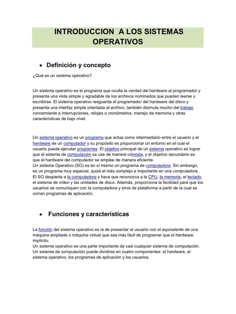 Un sistema operativo es un programa que acta como intermediario entre el usuario y el hardware de un computador y su propsito es proporcionar un entorno en el cual el usuario pueda ejecutar programas. El objetivo principal de un sistema operativo es lograr que el sistema de computacin se use de manera cmoda, y el objetivo secundario es que el hardware del computador se emplee de manera eficiente. Un sistema Operativo (SO) es en s mismo un programa de computadora. Sin embargo, es un programa muy especial, quiz el ms complejo e importante en una computadora. El SO despierta a la computadora y hace que reconozca a la CPU, la memoria, el teclado, el sistema de vdeo y las unidades de disco. Adems, proporciona la facilidad para que los usuarios se comuniquen con la computadora y sirve de plataforma a partir de la cual se corran programas de aplicacin.