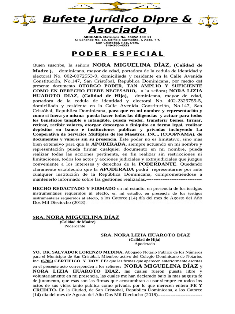 Cristóbal, Republica Dominicana, para que en mi nombre y representación y