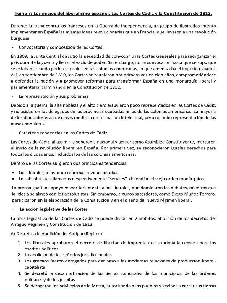 Tema 7: Los inicios del liberalismo español. Las Cortes de Cádiz y la Constitución de 1812.