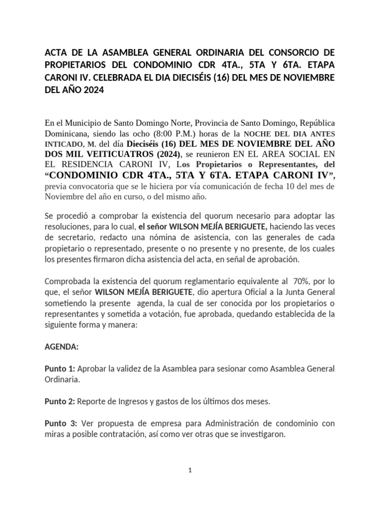 sometiendo la presente agenda, la cual de ser conocida por los propietarios o