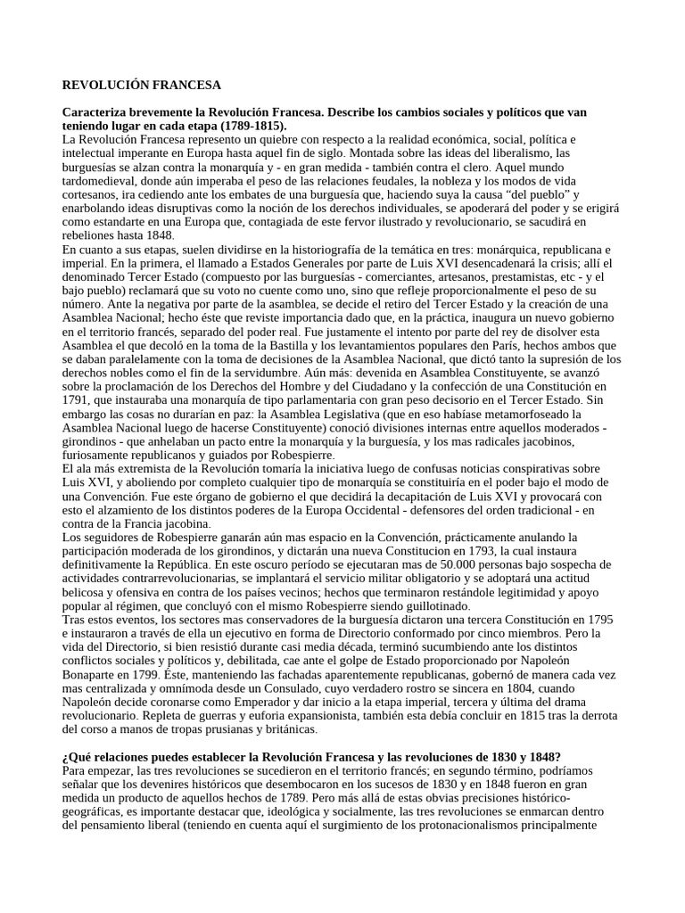 Caracteriza brevemente la Revolución Francesa. Describe los cambios sociales y políticos que van