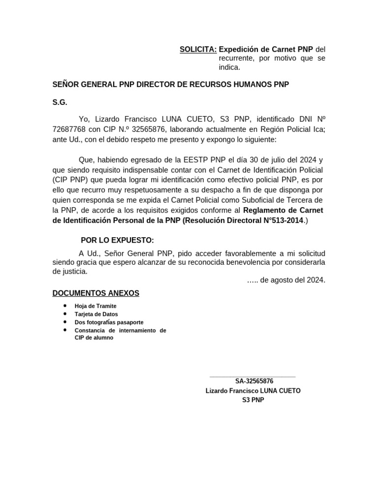 A Ud., Señor General PNP, pido acceder favorablemente a mi solicitud