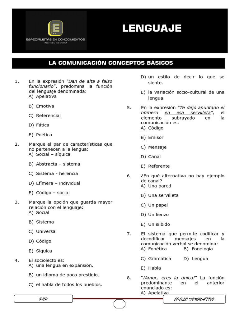 E) Función fática :canal D) La lengua es sicofísica y hace uso
