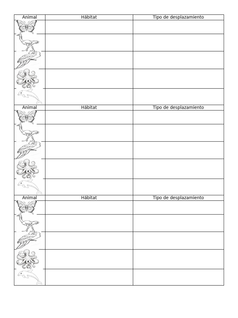 Tabla de Animales y Desplazamiento