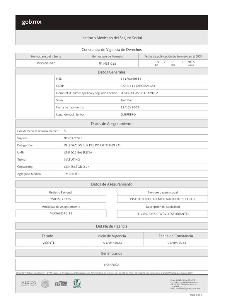 Cadena Original: ||Invocante:portalimssdigital|Tipo de trámite:COMPROBANTE DE VIGENCIA DE DERECHOHABIENTES|Fecha:02 de septiembre 2023,