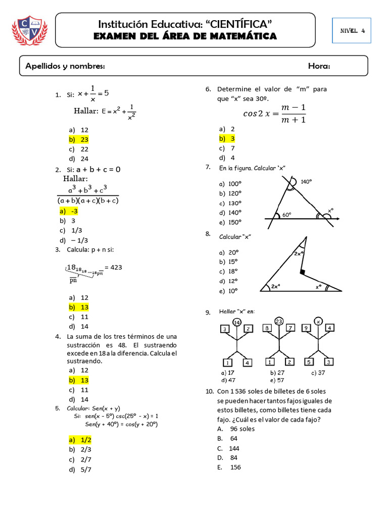 EXAMEN DEL ÁREA DE MATEMÁTICA
