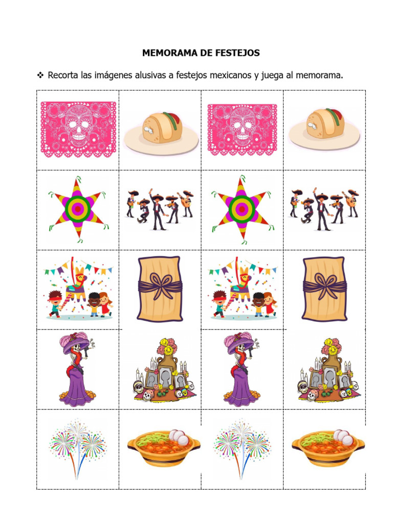 Recorta las imágenes alusivas a festejos mexicanos y juega al memorama.