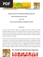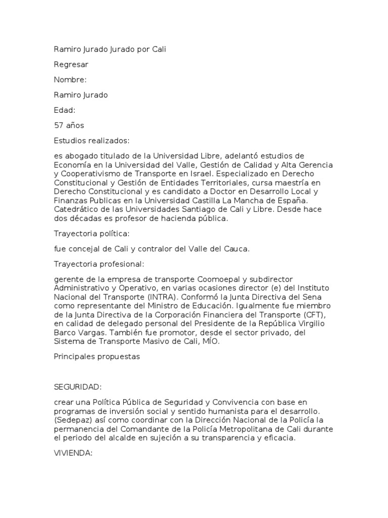 construir viviendas de inters prioritario y social en asocio con Cajas de Compensacin, Fondo Nacional del Ahorro, y entidades privadas. Ampliacin del rea mnima habitable. EDUCACIN: implementar una jornada educativa completa (7:00 a 5:00 pm) promoviendo la ocupacin ldica, recreativa, artstica y pedaggica en prevencin de amenazas del vicio y la delincuencia, y la desercin escolar. Promover una 'Cali Bilinge'. Estudiantes de planteles oficiales hablarn ingls como segunda lengua. SALUD: vincular 450 mil personas ms al Rgimen Subsidiado. Gestin a favor de grupos especiales (taxistas, vigilantes, etc). SERVICIOS PBLICOS: lograr que el agua potable llegue a un milln de habitantes ms. Alternativas de suministro (proyectos de embalses de ros y conduccin por bombeo o gravedad) en garanta de regularidad, mejor calidad y menores costos de tratamiento. Propone igualmente recuperar Emcali en garanta de manejo transparente y eficaz desde Cali y por los caleos. TRANSPORTE: configurar recorridos del transporte pblico en tiempos mnimos. Optimizacin de corredores viales para reducir tiempos de vehculos pblicos y particulares. Crear un Plan Maestro de Ciclo-Rutas, recuperacin de andenes, reorganizacin de espacios pblicos y estacionamiento de vehculos de todo tipo en proximidades al Sistema MO. RAMIRO JURADO Fortalezas: toda la vida ha en los sectores polticos y como transportador conoce alguna temtica municipal. Como catedrtico universitario ha tenido cercana con las juventudes. Debilidades: muy cercano a los triunfos de los ltimos Alcaldes, que precisamente carecen de prestigio ante la opinin pblica. Es un empresario del transporte que, como poltico, nunca ha podido redondear un triunfo personal. http://caliescribe.com/politica/2011/04/24/235-conozca-25-candidatosalcaldia