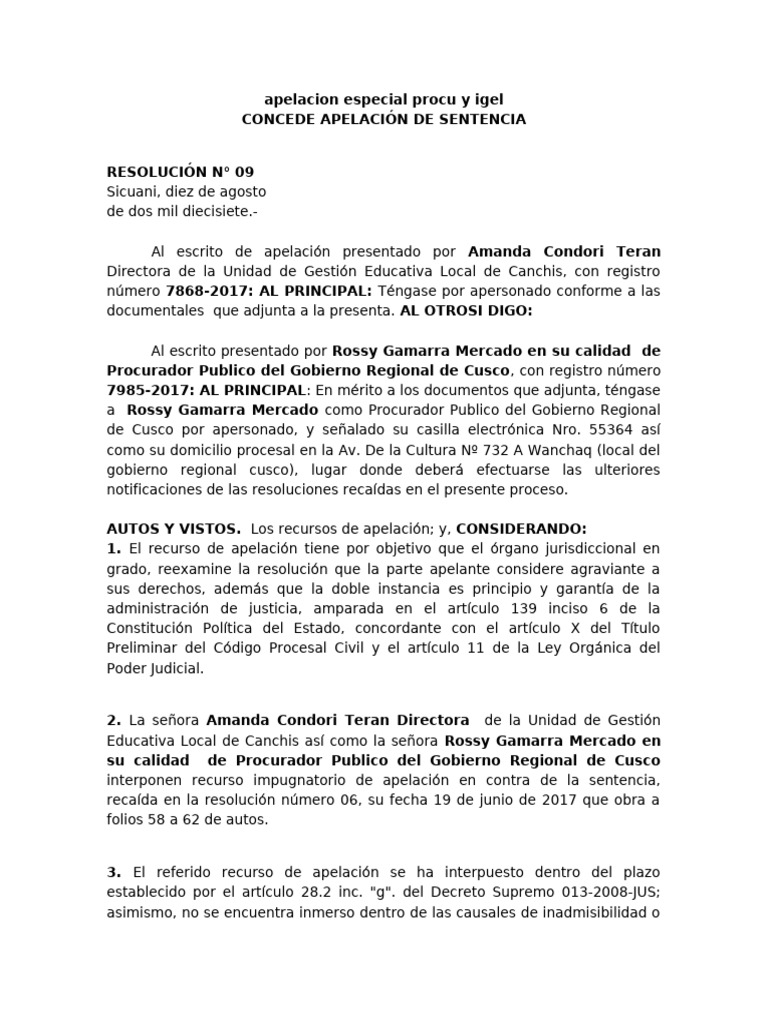 de Gestión Educativa Local de Canchis, interpone recurso de apelación en