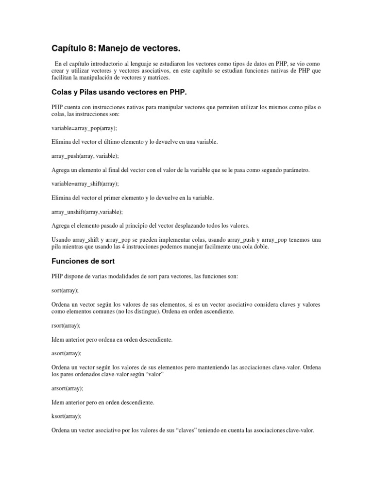 crear y utilizar vectores y vectores asociativos, en este capítulo se estudian funciones nativas de PHP que