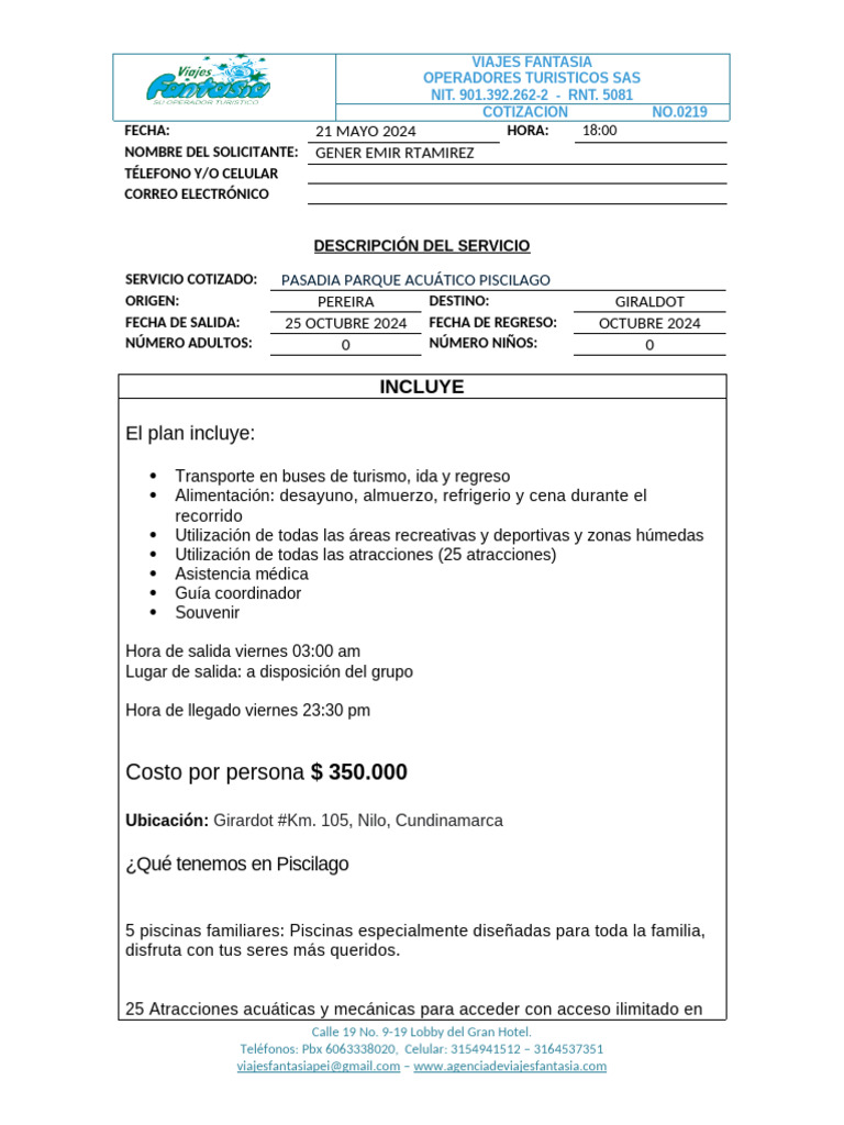 SERVICIO COTIZADO: PASADIA PARQUE ACUÁTICO PISCILAGO