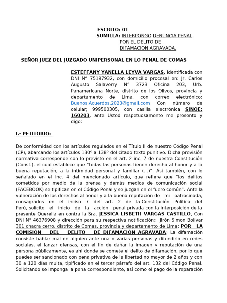 Perú, solicito el inicio de la acción penal privada con la interposición de la