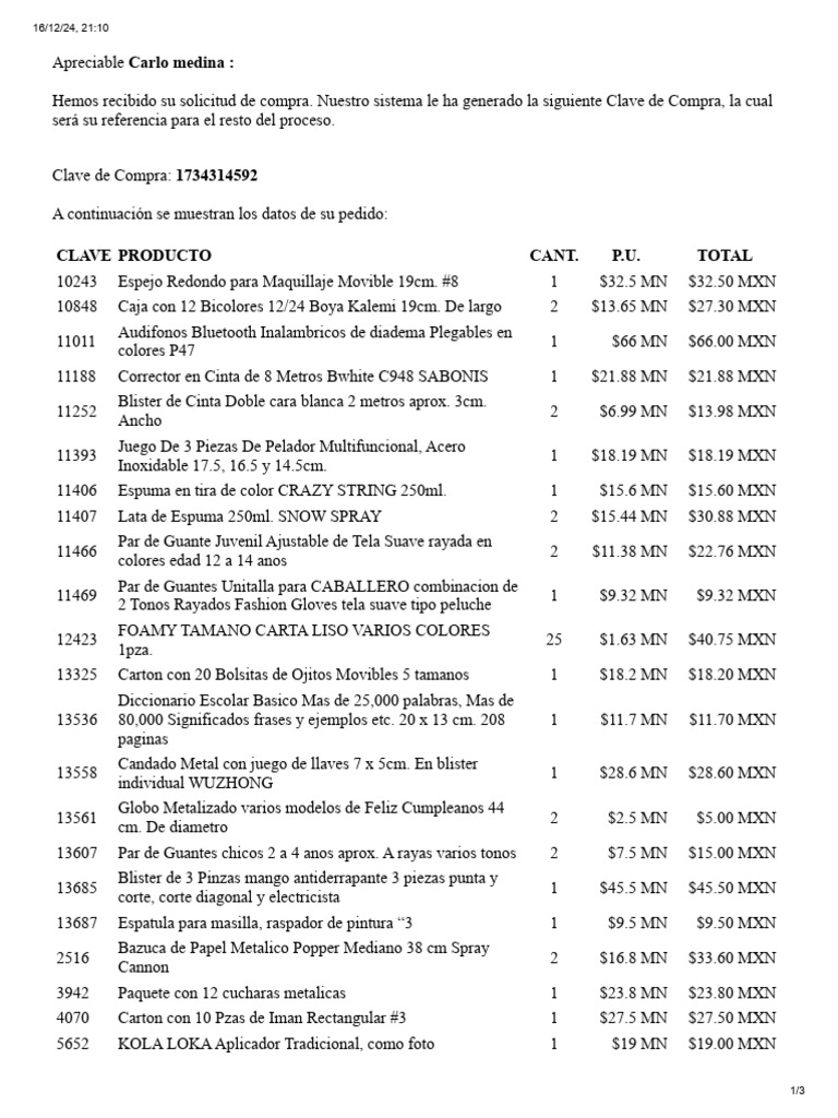 Hemos recibido su solicitud de compra. Nuestro sistema le ha generado la siguiente Clave de Compra, la cual