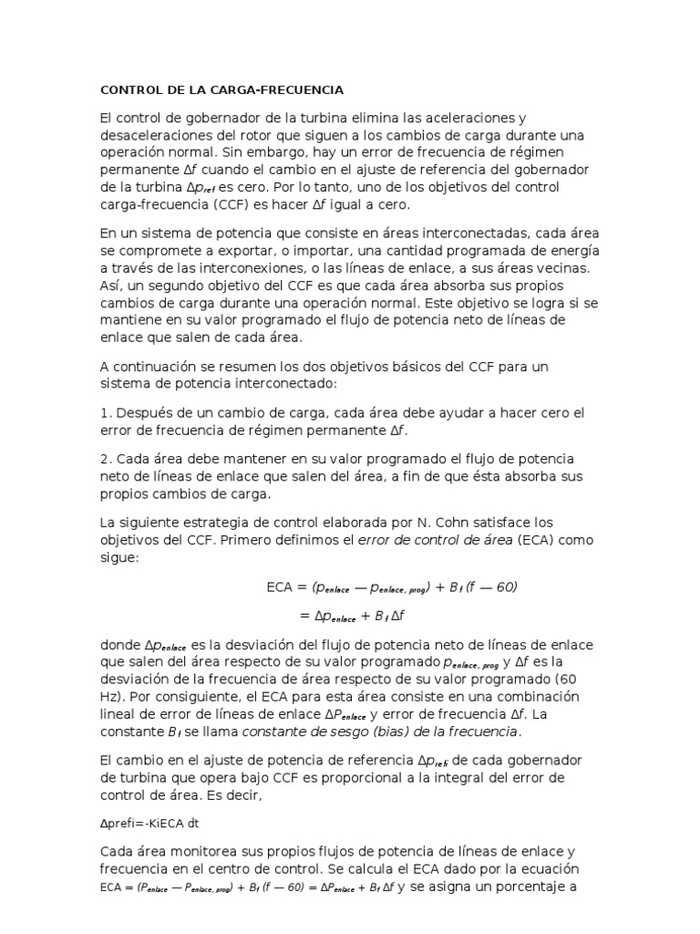 El control de gobernador de la turbina elimina las aceleraciones y desaceleraciones del rotor que siguen a los cambios de carga durante una operacin normal. Sin embargo, hay un error de frecuencia de rgimen permanente f cuando el cambio en el ajuste de referencia del gobernador de la turbina pref es cero. Por lo tanto, uno de los objetivos del control carga-frecuencia (CCF) es hacer f igual a cero. En un sistema de potencia que consiste en reas interconectadas, cada rea se compromete a exportar, o importar, una cantidad programada de energa a travs de las interconexiones, o las lneas de enlace, a sus reas vecinas. As, un segundo objetivo del CCF es que cada rea absorba sus propios cambios de carga durante una operacin normal. Este objetivo se logra si se mantiene en su valor programado el flujo de potencia neto de lneas de enlace que salen de cada rea. A continuacin se resumen los dos objetivos bsicos del CCF para un sistema de potencia interconectado: 1. Despus de un cambio de carga, cada rea debe ayudar a hacer cero el error de frecuencia de rgimen permanente f. 2. Cada rea debe mantener en su valor programado el flujo de potencia neto de lneas de enlace que salen del rea, a fin de que sta absorba sus propios cambios de carga. La siguiente estrategia de control elaborada por N. Cohn satisface los objetivos del CCF. Primero definimos el error de control de rea (ECA) como sigue: ECA = (penlace penlace, prog) + Bf (f 60) = penlace + Bf f donde penlace es la desviacin del flujo de potencia neto de lneas de enlace que salen del rea respecto de su valor programado penlace, prog y f es la desviacin de la frecuencia de rea respecto de su valor programado (60 Hz). Por consiguiente, el ECA para esta rea consiste en una combinacin lineal de error de lneas de enlace Penlace y error de frecuencia f. La constante Bf se llama constante de sesgo (bias) de la frecuencia. El cambio en el ajuste de potencia de referencia prefi de cada gobernador de turbina que opera bajo CCF es proporcional a la integral del error de control de rea. Es decir,