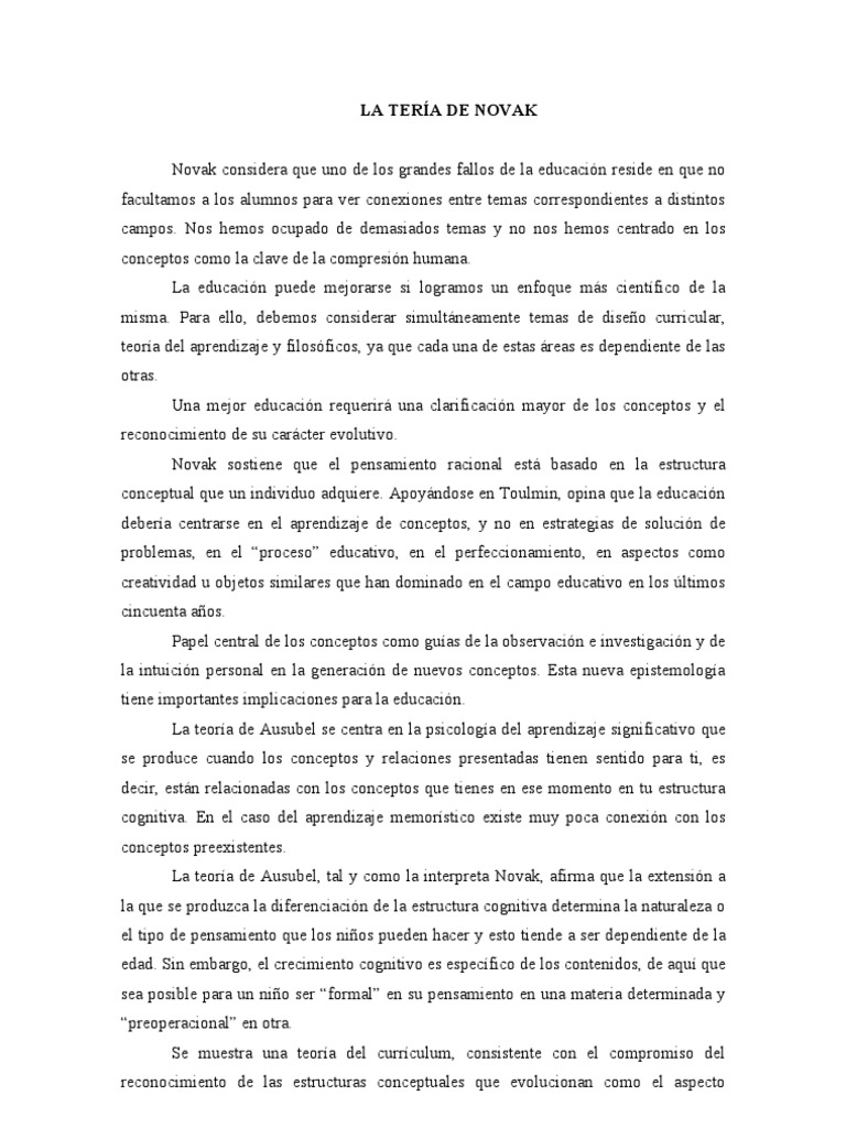 para ver conexiones entre temas correspondientes a distintos campos. Nos hemos ocupado de demasiados temas y no nos hemos centrado en los conceptos como la clave de la compresin humana. La educacin puede mejorarse si logramos un enfoque ms cientfico de la misma. Para ello, debemos considerar simultneamente temas de diseo curricular, teora del aprendizaje y filosficos, ya que cada una de estas reas es dependiente de las otras. Una mejor educacin requerir una clarificacin mayor de los conceptos y el reconocimiento de su carcter evolutivo. Novak sostiene que el pensamiento racional est basado en la estructura conceptual que un individuo adquiere. Apoyndose en Toulmin, opina que la educacin debera centrarse en el aprendizaje de conceptos, y no en estrategias de solucin de problemas, en el proceso educativo, en el perfeccionamiento, en aspectos como creatividad u objetos similares que han dominado en el campo educativo en los ltimos cincuenta aos. Papel central de los conceptos como guas de la observacin e investigacin y de la intuicin personal en la generacin de nuevos conceptos. Esta nueva epistemologa tiene importantes implicaciones para la educacin. La teora de Ausubel se centra en la psicologa del aprendizaje significativo que se produce cuando los conceptos y relaciones presentadas tienen sentido para ti, es decir, estn relacionadas con los conceptos que tienes en ese momento en tu estructura cognitiva. En el caso del aprendizaje memorstico existe muy poca conexin con los conceptos preexistentes. La teora de Ausubel, tal y como la interpreta Novak, afirma que la extensin a la que se produzca la diferenciacin de la estructura cognitiva determina la naturaleza o el tipo de pensamiento que los nios pueden hacer y esto tiende a ser dependiente de la edad. Sin embargo, el crecimiento cognitivo es especfico de los contenidos, de aqu que sea posible para un nio ser formal en su pensamiento en una materia determinada y preoperacional en otra. Se muestra una teora del currculum, consistente con el compromiso del reconocimiento de las estructuras conceptuales que evolucionan como el aspecto