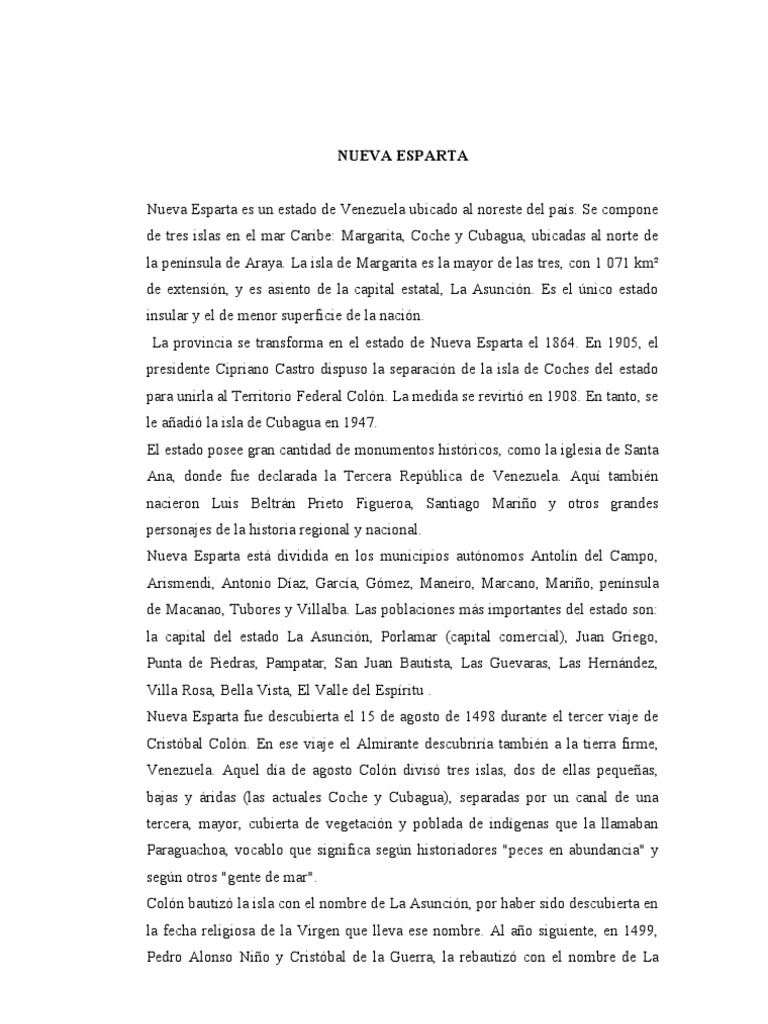 Se compone de tres islas en el mar Caribe: Margarita, Coche y Cubagua, ubicadas al norte de la pennsula de Araya. La isla de Margarita es la mayor de las tres, con 1 071 km de extensin, y es asiento de la capital estatal, La Asuncin. Es el nico estado insular y el de menor superficie de la nacin. La provincia se transforma en el estado de Nueva Esparta el 1864. En 1905, el presidente Cipriano Castro dispuso la separacin de la isla de Coches del estado para unirla al Territorio Federal Coln. La medida se revirti en 1908. En tanto, se le aadi la isla de Cubagua en 1947. El estado posee gran cantidad de monumentos histricos, como la iglesia de Santa Ana, donde fue declarada la Tercera Repblica de Venezuela. Aqu tambin nacieron Luis Beltrn Prieto Figueroa, Santiago Mario y otros grandes personajes de la historia regional y nacional. Nueva Esparta est dividida en los municipios autnomos Antoln del Campo, Arismendi, Antonio Daz, Garca, Gmez, Maneiro, Marcano, Mario, pennsula de Macanao, Tubores y Villalba. Las poblaciones ms importantes del estado son: la capital del estado La Asuncin, Porlamar (capital comercial), Juan Griego, Punta de Piedras, Pampatar, San Juan Bautista, Las Guevaras, Las Hernndez, Villa Rosa, Bella Vista, El Valle del Espritu . Nueva Esparta fue descubierta el 15 de agosto de 1498 durante el tercer viaje de Cristbal Coln. En ese viaje el Almirante descubrira tambin a la tierra firme, Venezuela. Aquel da de agosto Coln divis tres islas, dos de ellas pequeas, bajas y ridas (las actuales Coche y Cubagua), separadas por un canal de una tercera, mayor, cubierta de vegetacin y poblada de indgenas que la llamaban Paraguachoa, vocablo que significa segn historiadores "peces en abundancia" y segn otros "gente de mar". Coln bautiz la isla con el nombre de La Asuncin, por haber sido descubierta en la fecha religiosa de la Virgen que lleva ese nombre. Al ao siguiente, en 1499, Pedro Alonso Nio y Cristbal de la Guerra, la rebautiz con el nombre de La