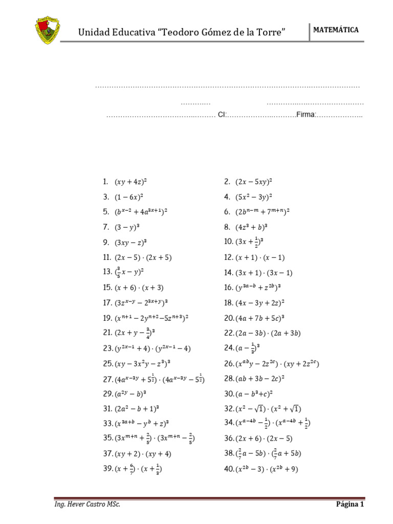 Unidad Educativa “Teodoro Gómez de la Torre” MATEMÁTICA